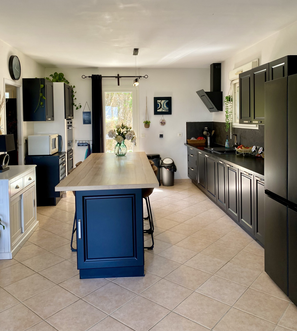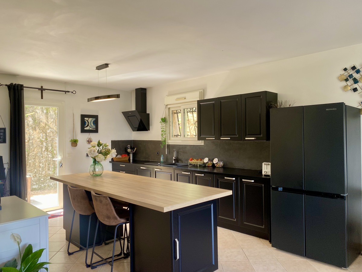 Une cuisine ouverte équipée et meublée avec un cellier/buanderie attenant; Une porte fenêtre permet d'accéder à une deuxième terrasse à l'arrière de la maison.